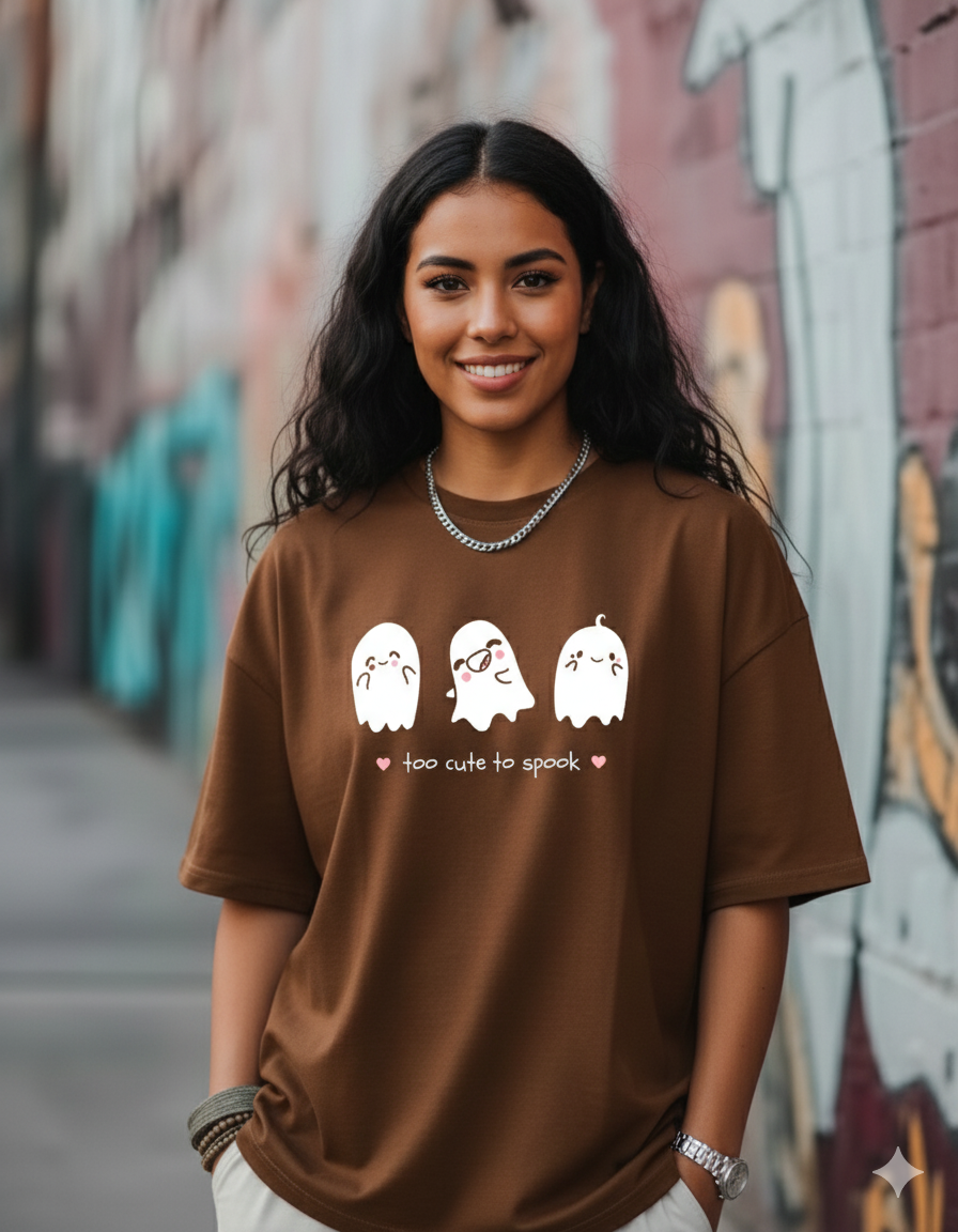 Stay spooky and sweet with this Unisex β€œTOO CUTE TO SPOOK” oversized T-shirt featuring three adorable ghost characters β€” perfect for Halloween vibes or everyday fun!