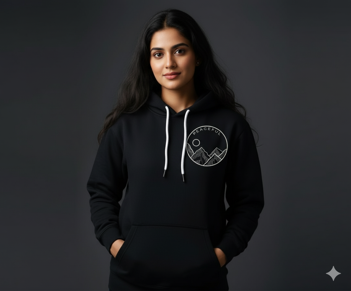 Whether you’re journaling with coffee, walking in nature, or zoning out with music — this hoodie blends peace + style effortlessly.